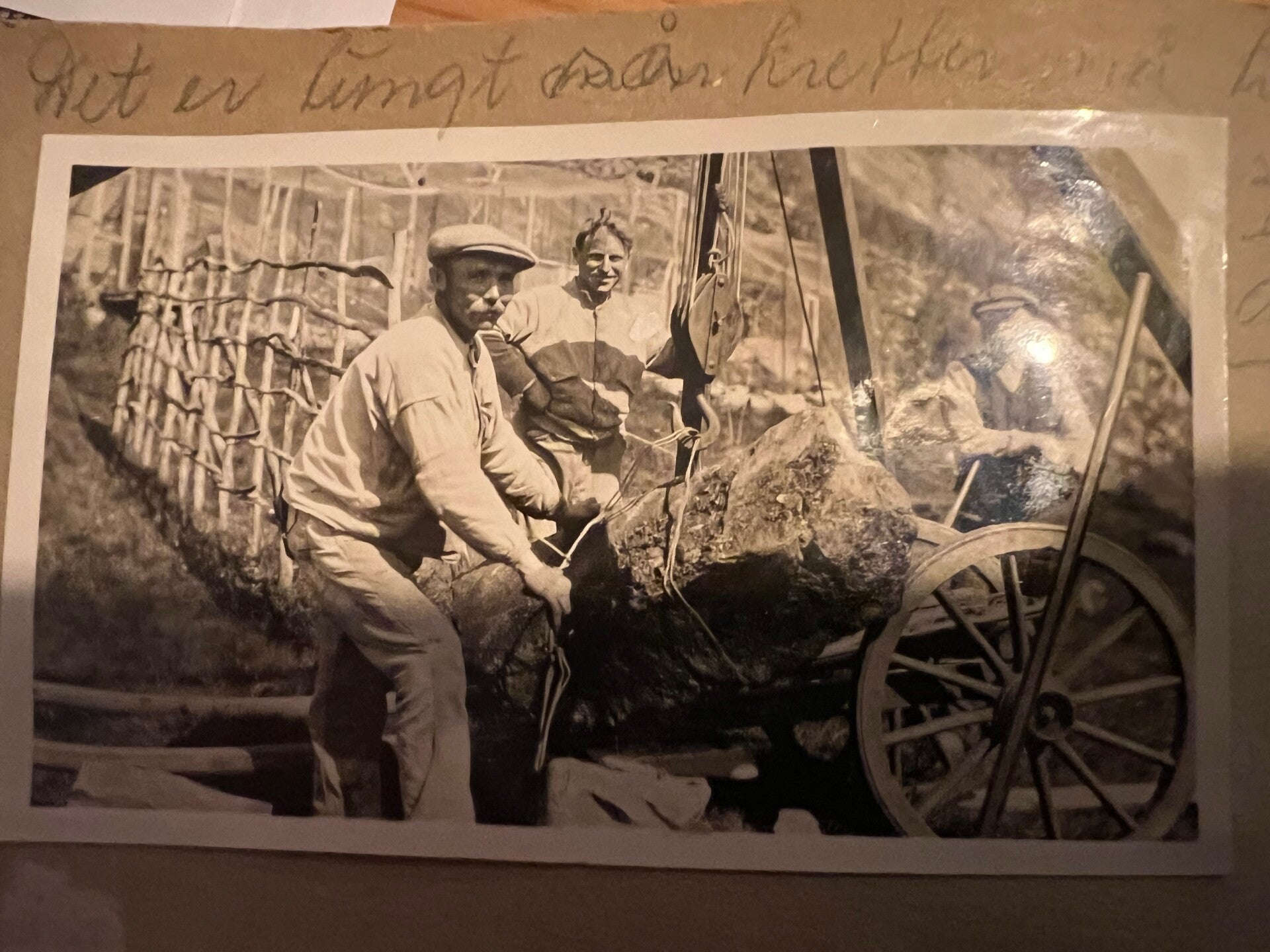 Å dyrke jorda i Dyrkolbotn kunne nok vera både hardt og krevande. Her er det Knut (1861-1945) og Haldor (1896-1992) på bruk 2 som fjernar ein stein i marka.